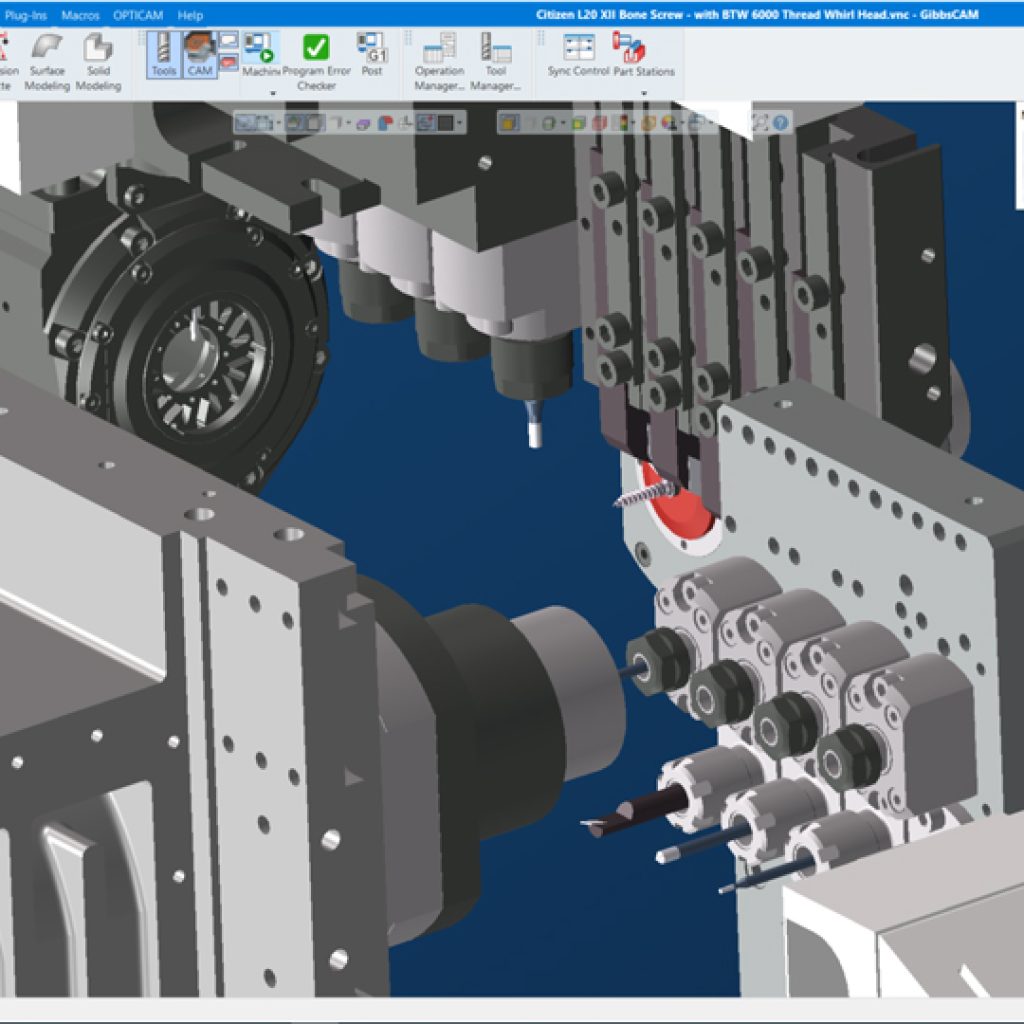Swiss-style lathes are designed for producing small, high-precision parts from bar stock using sliding headstock motion and guide bushing support to maintain rigidity and accuracy during machining. GibbsCAM Swiss Machining provides dedicated programming tools to coordinate multiple tool groups, spindles, and coordinated machining operations in complex Swiss machine environments.