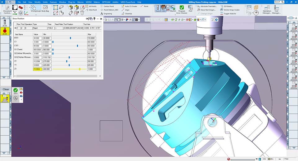 GibbsCAM Probing allows programmers to integrate measurement and inspection routines directly into CNC programs. These probing operations verify part positioning, establish offsets, and measure critical features throughout the machining process.